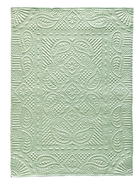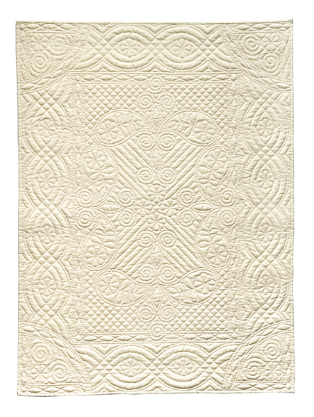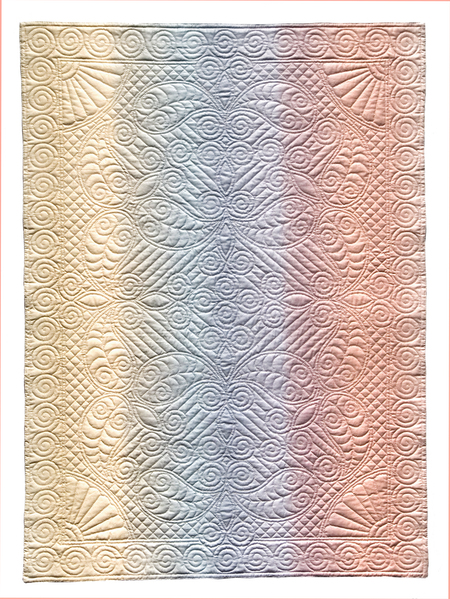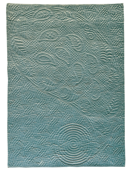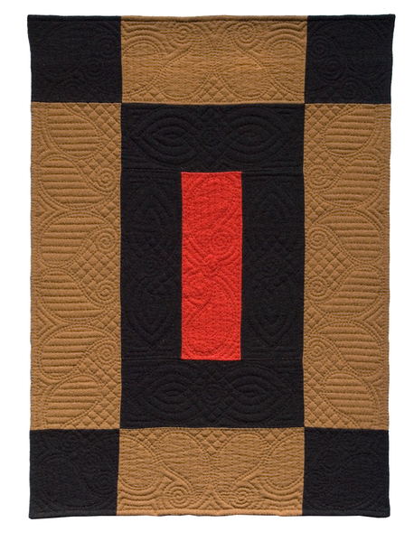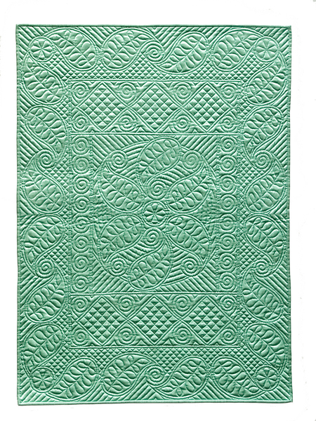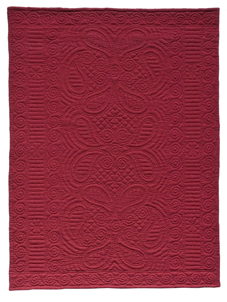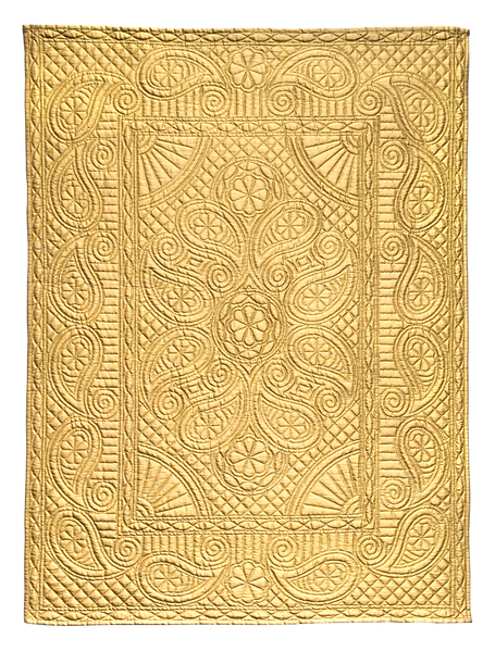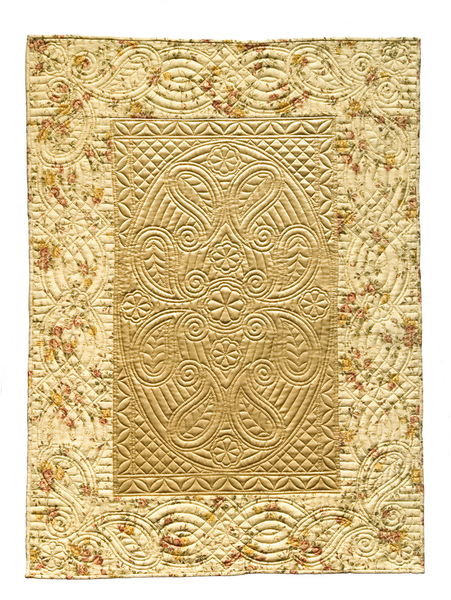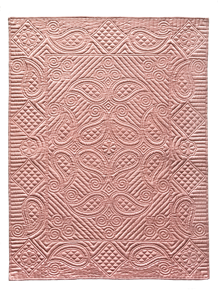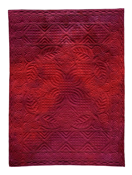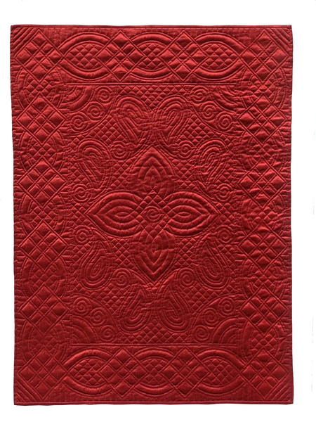 Although the 2016 paisley collection featured Mrs Thomas' paisley motif, not one of the quilts made was a red and white strippy. In 2018 Sandie set out not only to rectify this in a new design, but also to explore the effects of subtly altering both the Welsh trail pattern (with the addition of a spiral in the centre diamonds) and the fillings contained within the paisley motif. Machine pieced; hand quilted on silk dupion using Aurifil 28 thread.